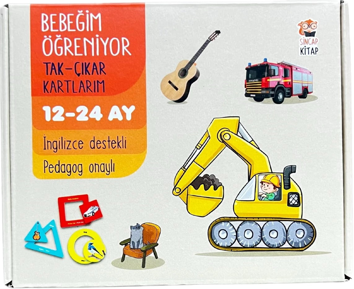12-24 Ay bebeklerin bilişsel ve sosyal gelişimlerine uygun olarak hazırlanan, İngilizce destekli tak-çıkar KARTLARIM’ la, Minik adımlar hayata atılırken; • Temel şekilleri puzzle yöntemiyle, Renkleri oyunla öğrenecek. Gerçek yaşamdan nesneleri ve yaşam alanlarını öğrenirken; • Sosyal yaşamla ilişki kurma, parça-bütün ilişkisi, eksik tamamlama, el- göz koordinasyonu gelişecek. Kelime hazinesi ve sözel iletişimi arttırırken; • Geniş öğrenme yelpazesinde bilişsel ve sosyal zekaları hızla gelişecek.