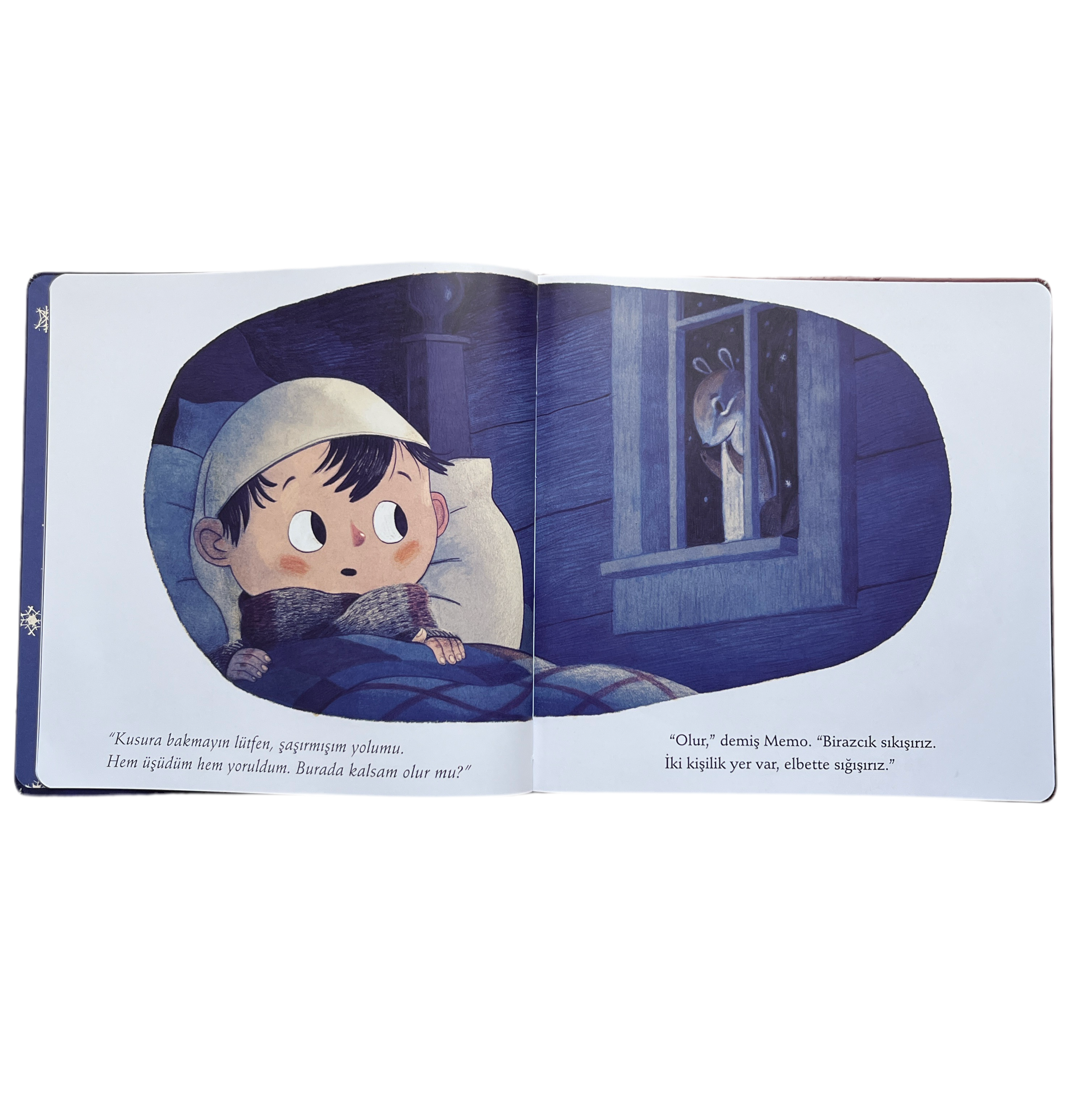 Soğuk bir kış gecesi sütünü içip yatağına yatan küçük Memo’yu tatlı bir sürpriz beklemektedir. Kendilerine uyuyacak sıcak bir yer arayan hayvanlar teker teker onun kapısını çalmaya başlar. Hayvanların kimisi küçük kimisi daha büyük kimisi de KOCAMANDIR. Memo hiçbirini geri çevirmez, hepsini nazikçe içeri buyur eder. Çünkü küçük Memo’nun kocaman kalbinde herkese yetecek kadar yer vardır. İyi Uykular ...
