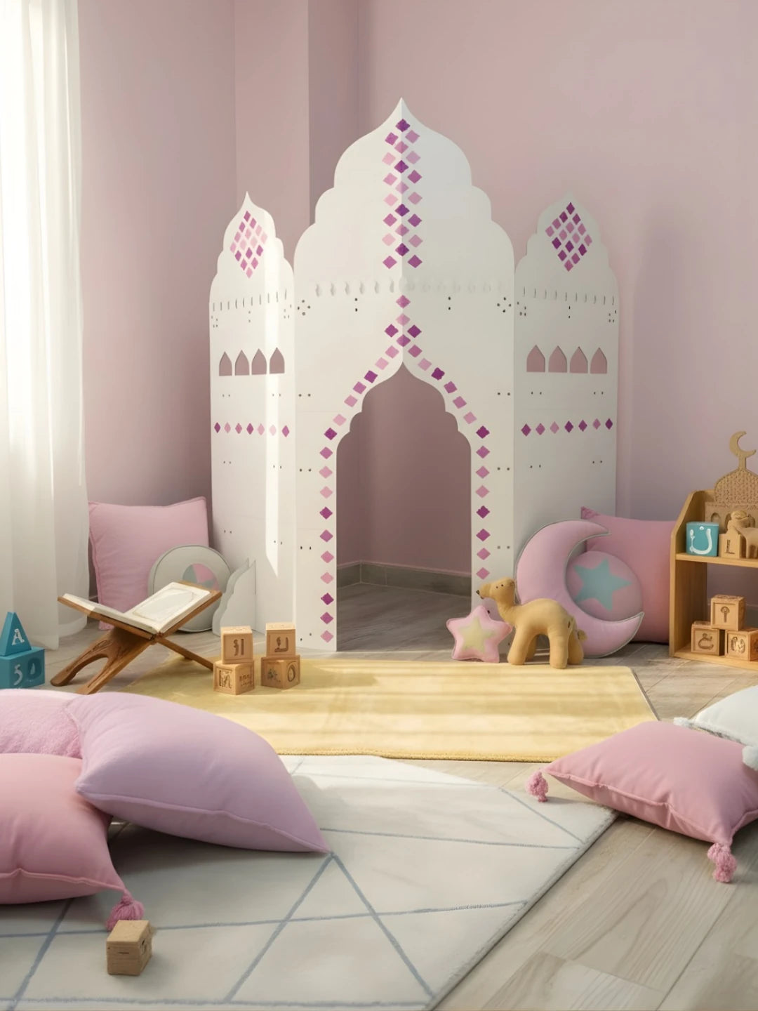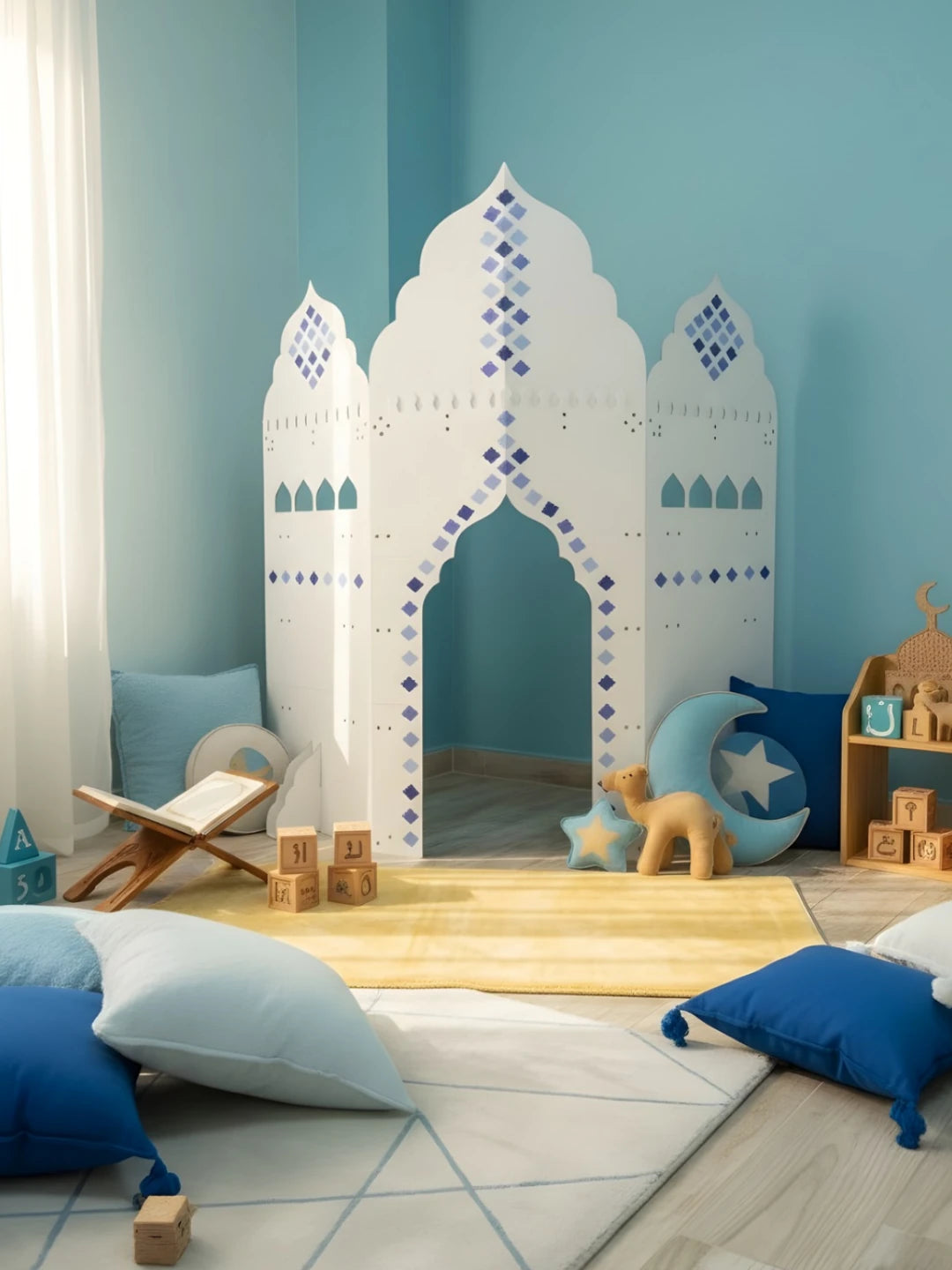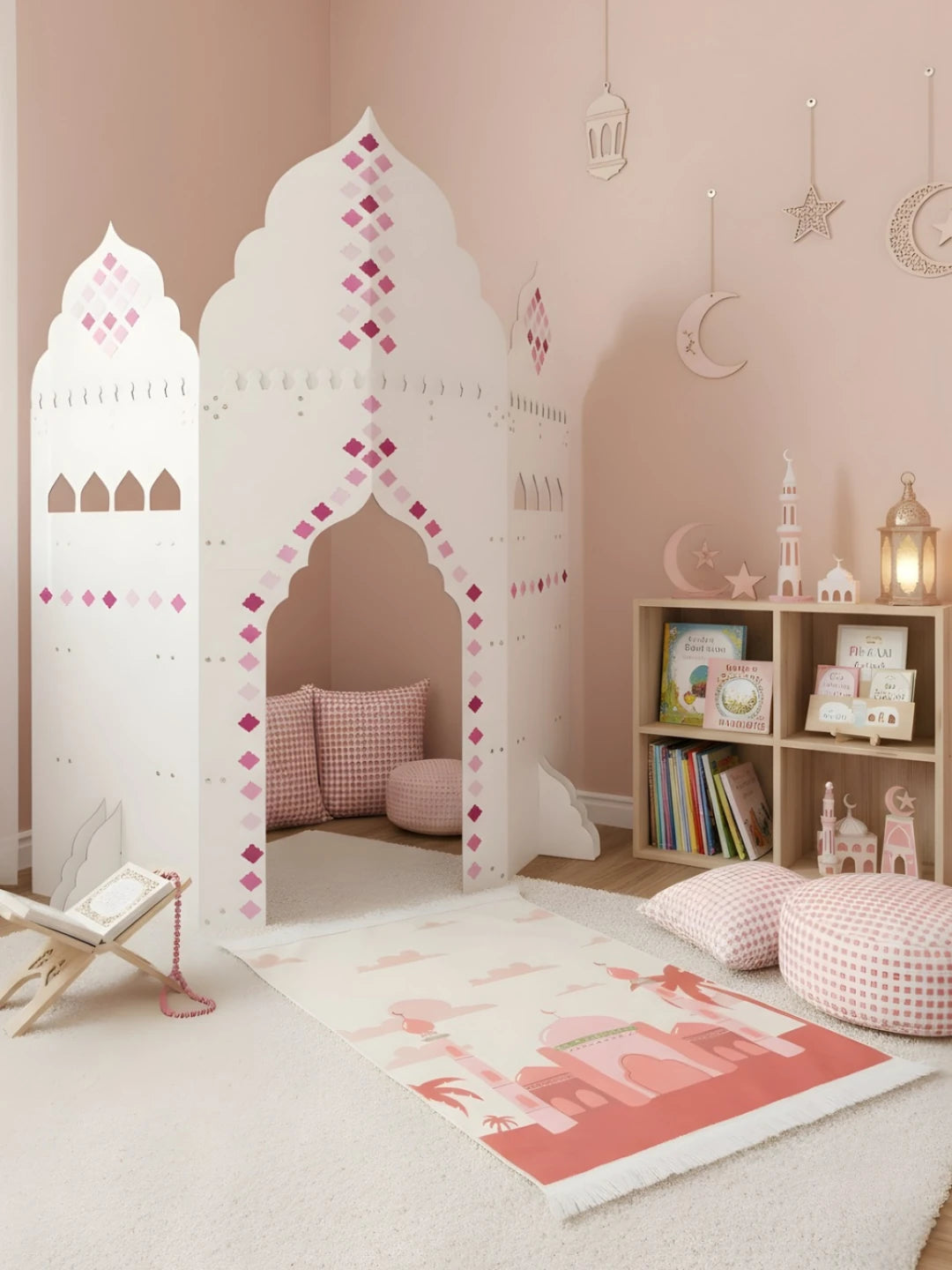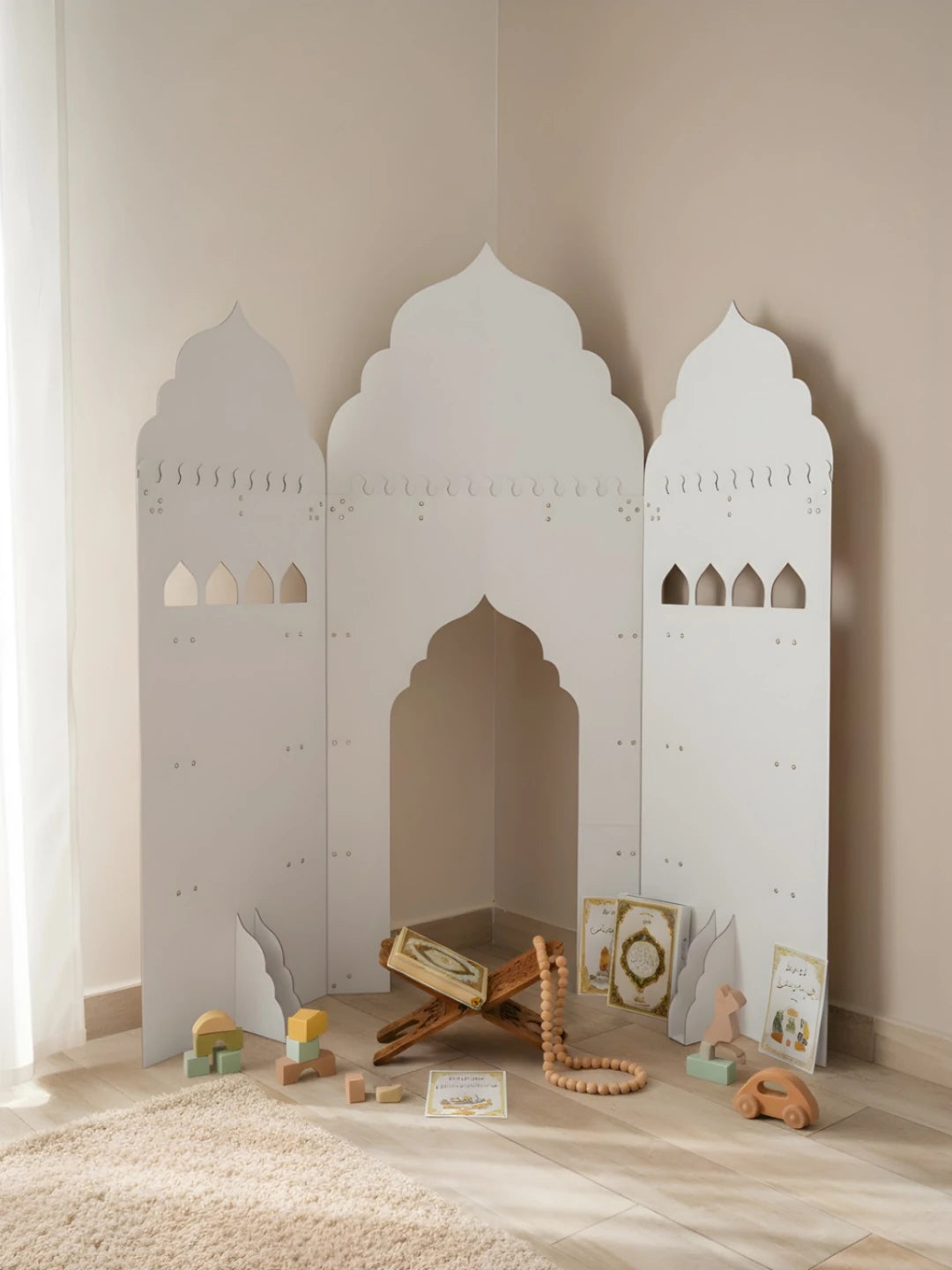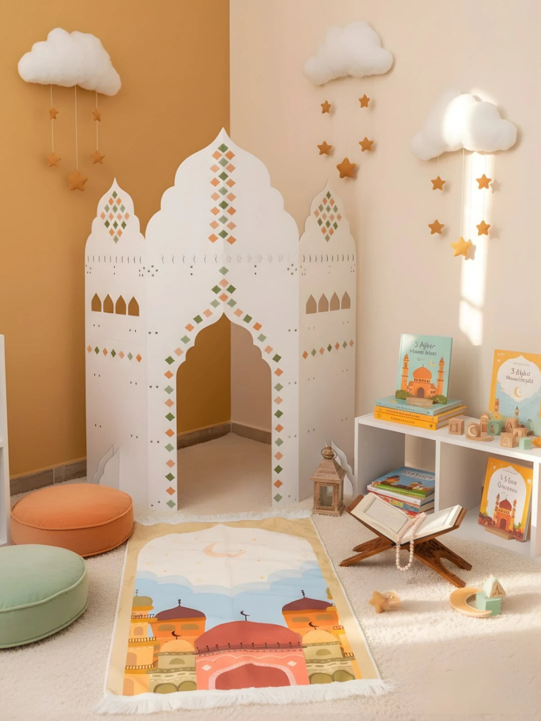 Das Mini-Mescit passt ideal in eine Ecke des Zuhauses und bietet einen ruhigen, bedeutungsvollen Ort für Gebet, Duʿā, die drei heiligen Monate, Ramadan-Aktivitäten und Besinnung. Gleichzeitig entsteht ein eigener Bereich für Kinder – warm, persönlich und auch zum ruhigen Spielen geeignet.