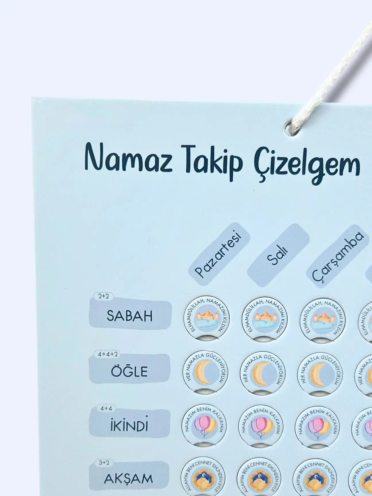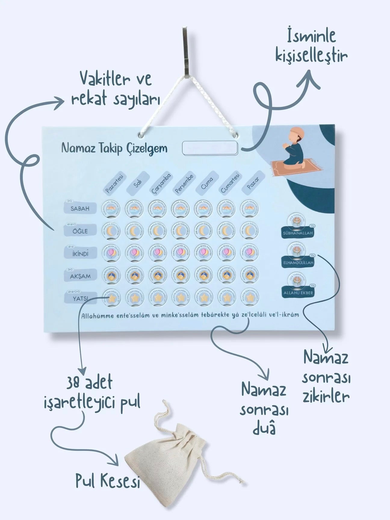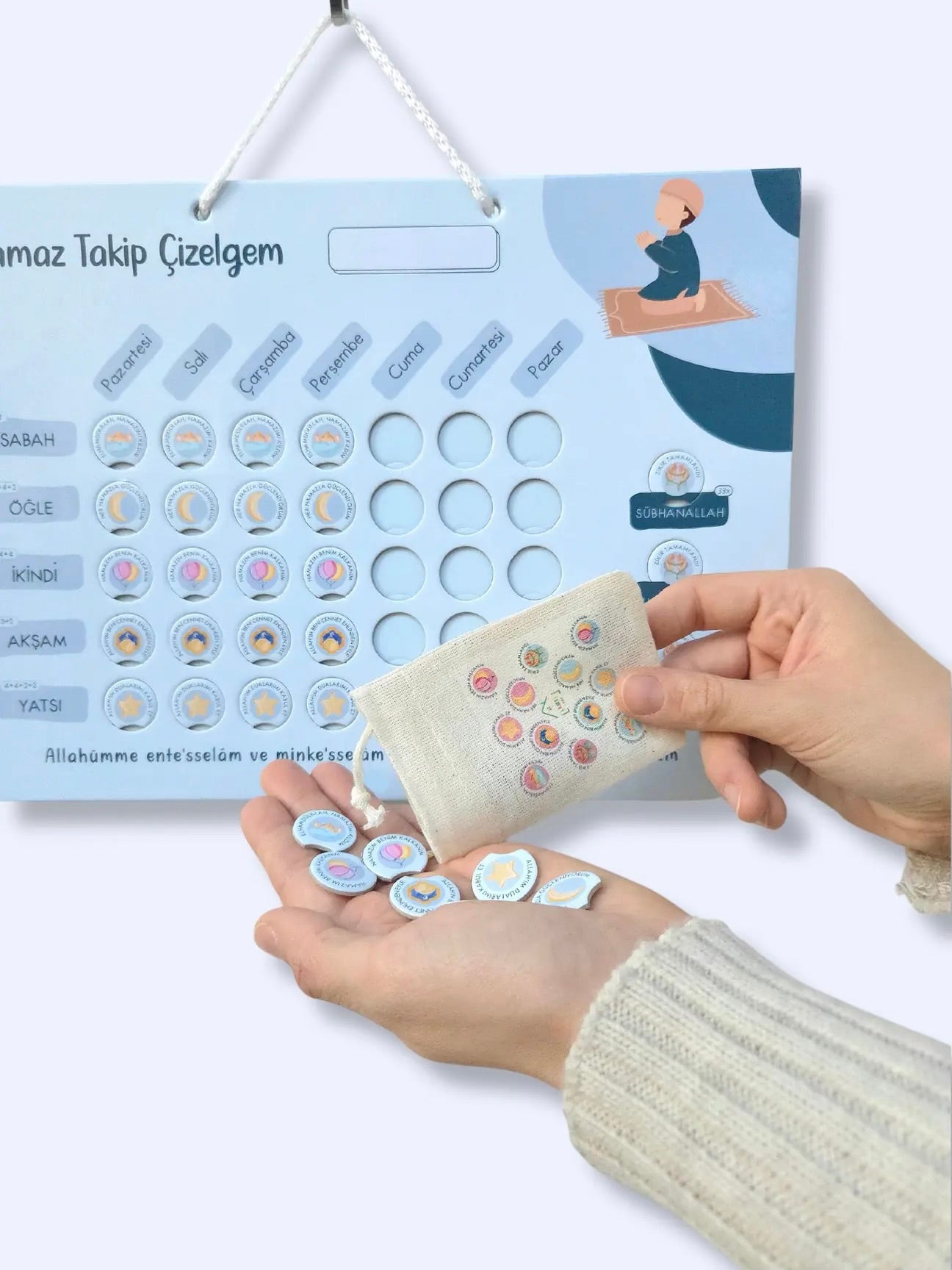 Setle birlikte gelen 38 adet işaretleyici pul, her kılınan namaz ve çekilen her zikir için çizelgeye keyifle takılır. Böylece çocuklar başarılarını somut şekilde görür ve devam etmeye istek duyar.
