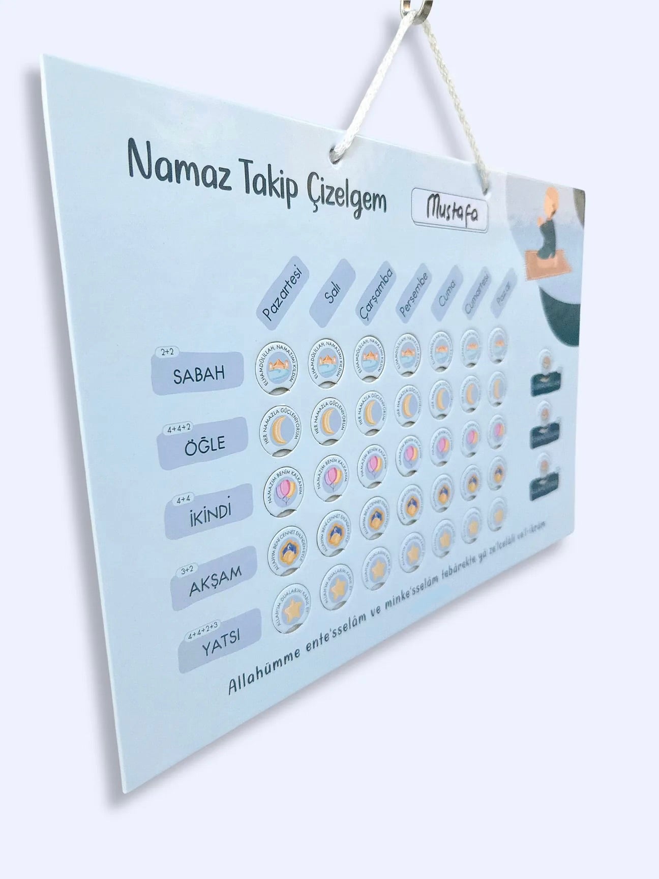 Kişiselleştirilebilir Namaz Takip Çizelgemiz, miniklerin ibadetle olan bağını sevgi dolu bir şekilde güçlendirmek için tasarlandı.