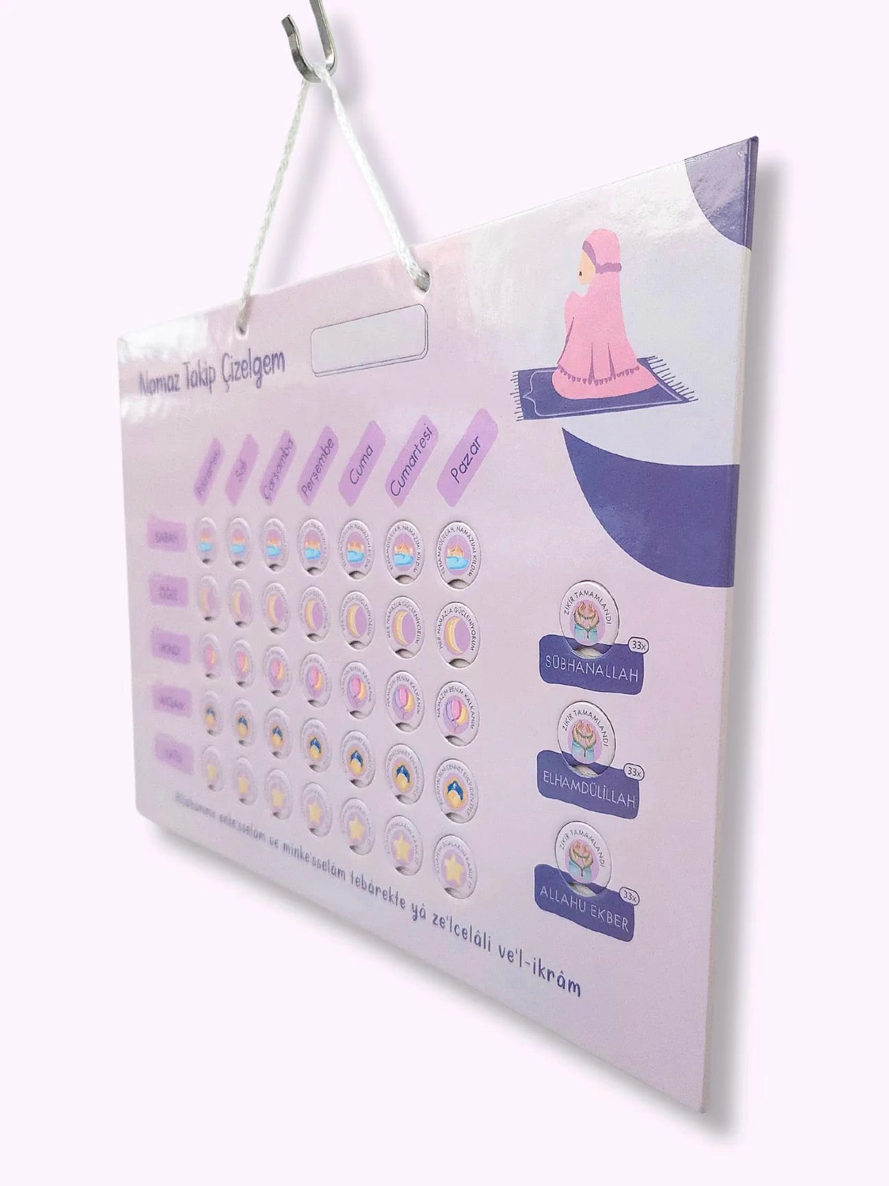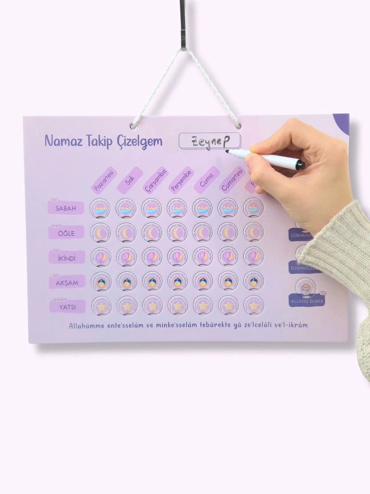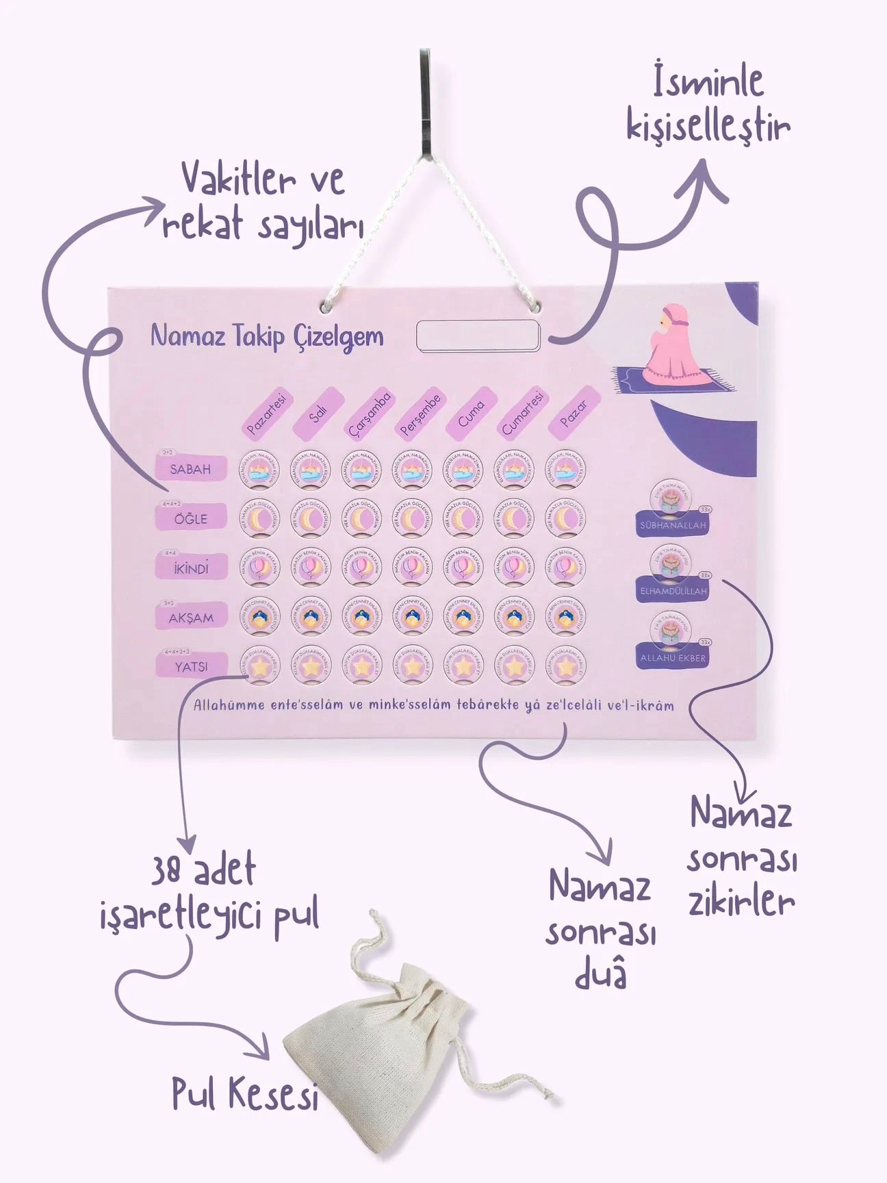 Kişiselleştirilebilir Namaz Takip Çizelgemiz, miniklerin ibadetle olan bağını sevgi dolu bir şekilde güçlendirmek için tasarlandı.