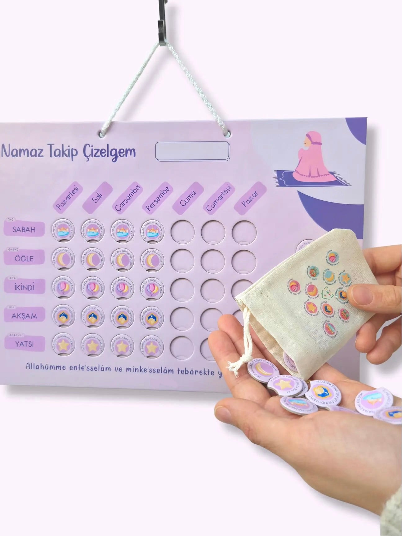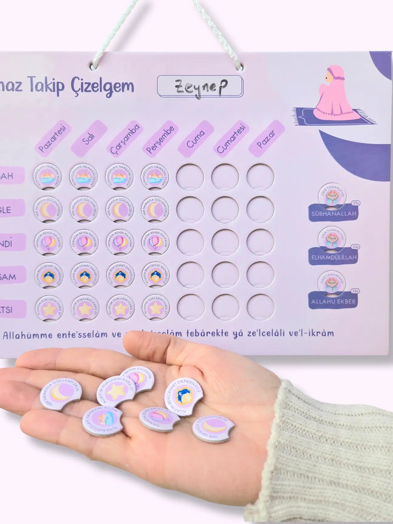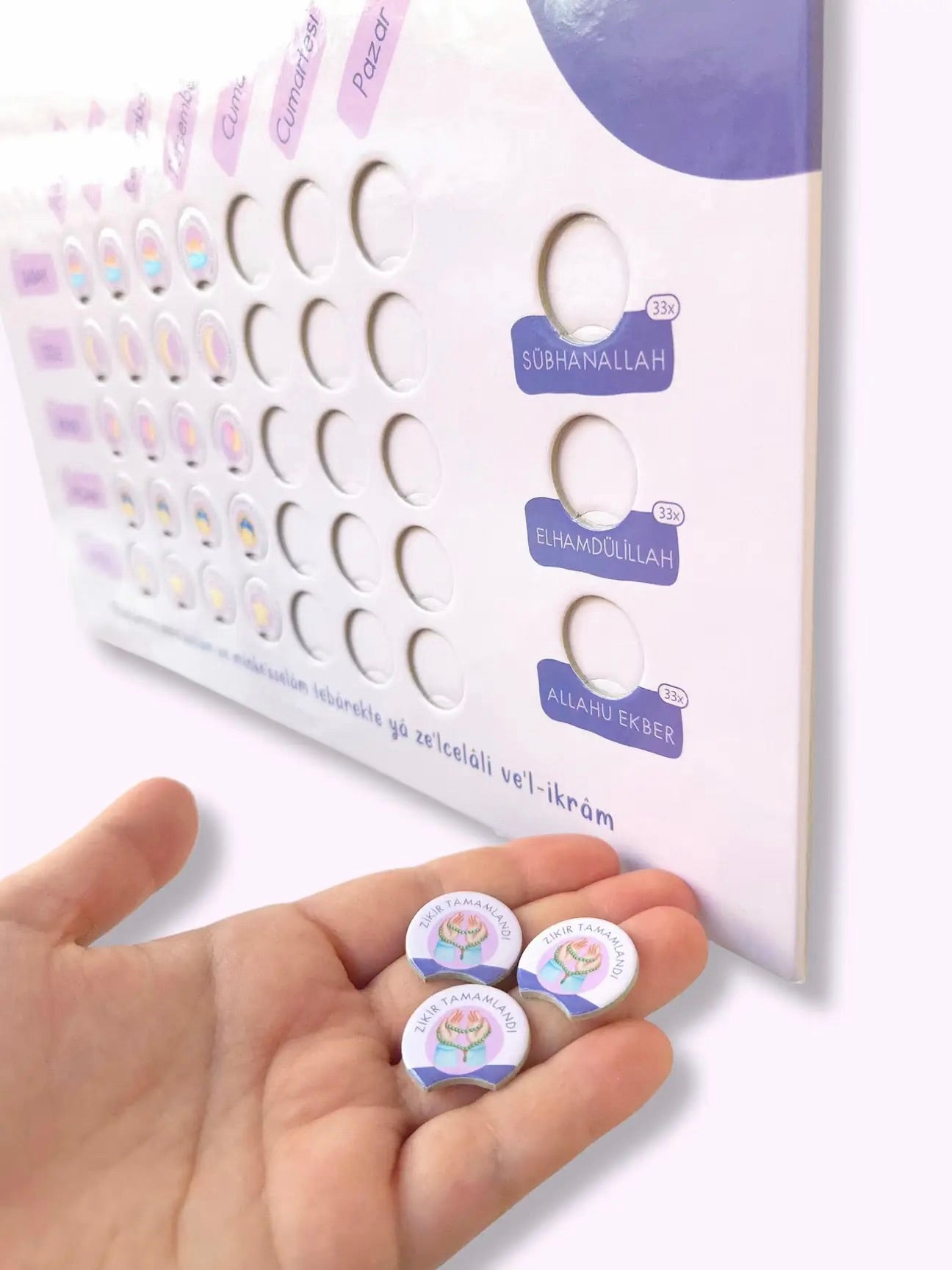 Setle birlikte gelen 38 adet işaretleyici pul, her kılınan namaz ve çekilen her zikir için çizelgeye keyifle takılır. Böylece çocuklar başarılarını somut şekilde görür ve devam etmeye istek duyar.
