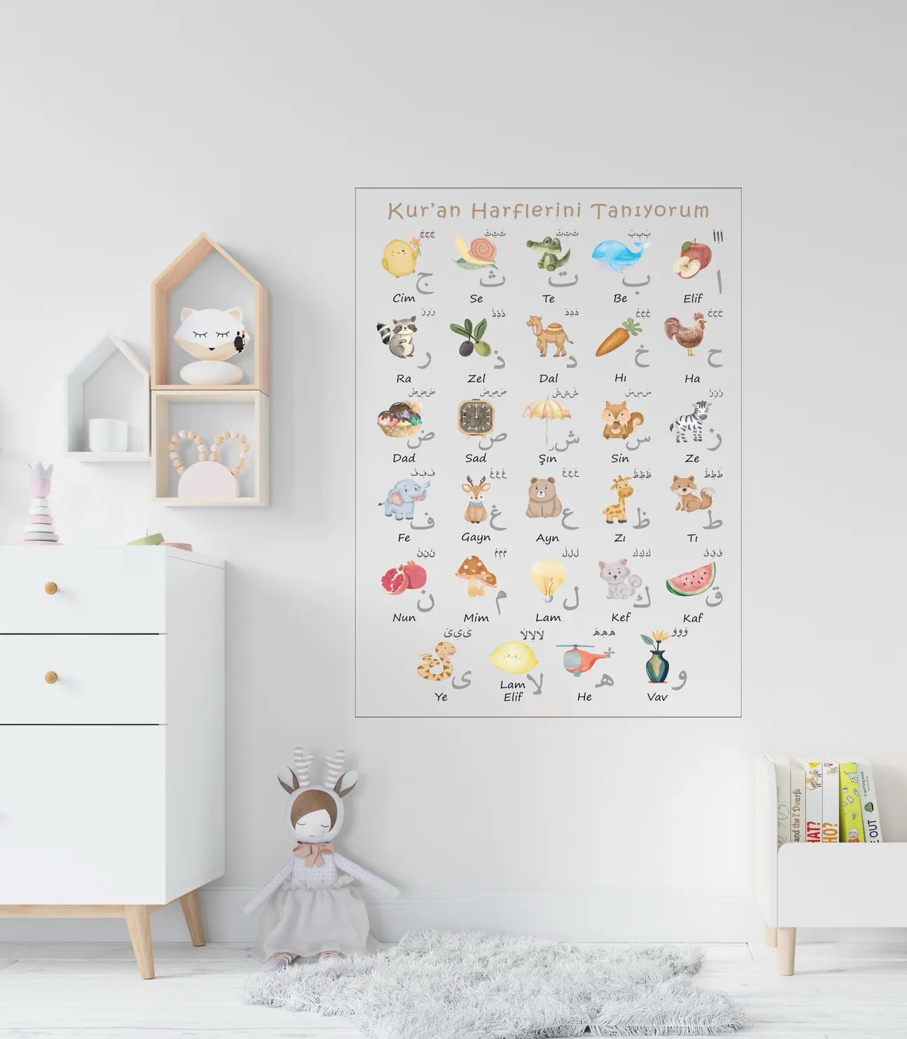 „Kur'an harflerini öğrenmek” posteri, çocuklar için akılda kalıcı şekilde öğrenmelerini teşvik etmek ve eğlenmeleri için tasarlanmıştır.