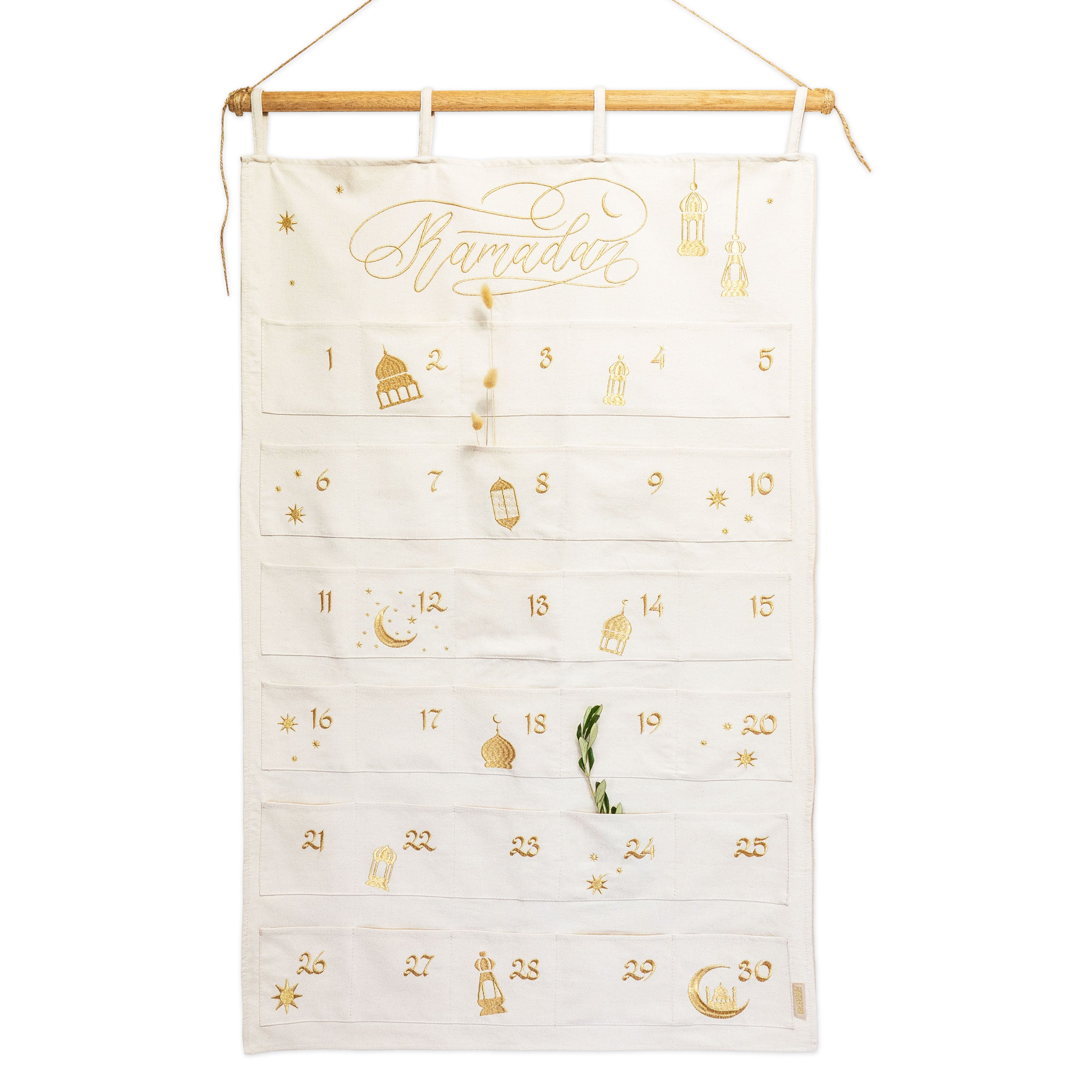 Mit diesem wunderschönen Ramadankalender gehen (nicht nur) Kinderträume in Erfüllung. Durch die angenehme Größe der 30 Stoffbeutel eignet er sich ideal zum Verpacken von Süßigkeiten, Gutscheinen oder anderen kleinen Geschenken. Dieser Ramadankalender kann jedes Jahr wiederverwendet werden und schont somit nicht nur die Umwelt, sondern auch deinen Geldbeutel. Aufgehangen ist dieser individuell gestaltete Kalender ein echter Hingucker im Fastenmonat (Tipp: Das Aufhängen an einem oder zwei Ästen hat uns besonders gut gefallen). Komplette Größe des Kalenders: 70cm x 110cm + Schlaufen. Größe der Taschen: Breite 12cm, Höhe 11,5cm